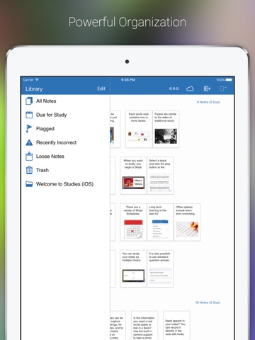 There are Studies apps for iPhone, iPad, and Mac (separate purchase), and they sync up beautifully via iCloud. Start studying in class with Studies for Mac, continue on the bus ride home with Studies for iPhone, and finish off on the sofa with Studies for iPad.