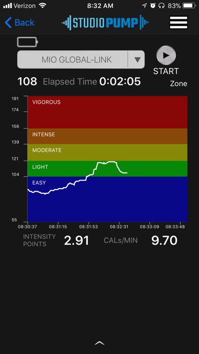 • View real time heart rate displayed in colored heart rate zone