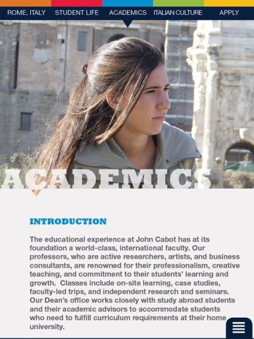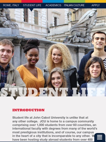 This app provides John Cabot University study abroad students with information about student life, academics, and the application process, in addition to travel tips and information about Rome and Italian culture.