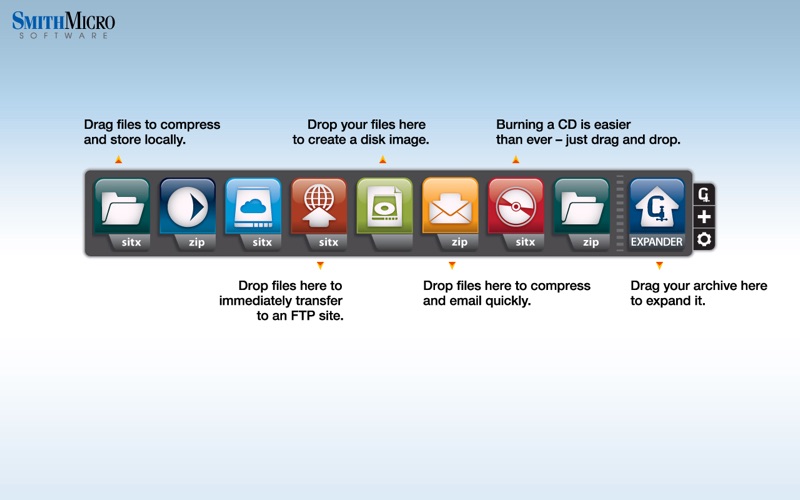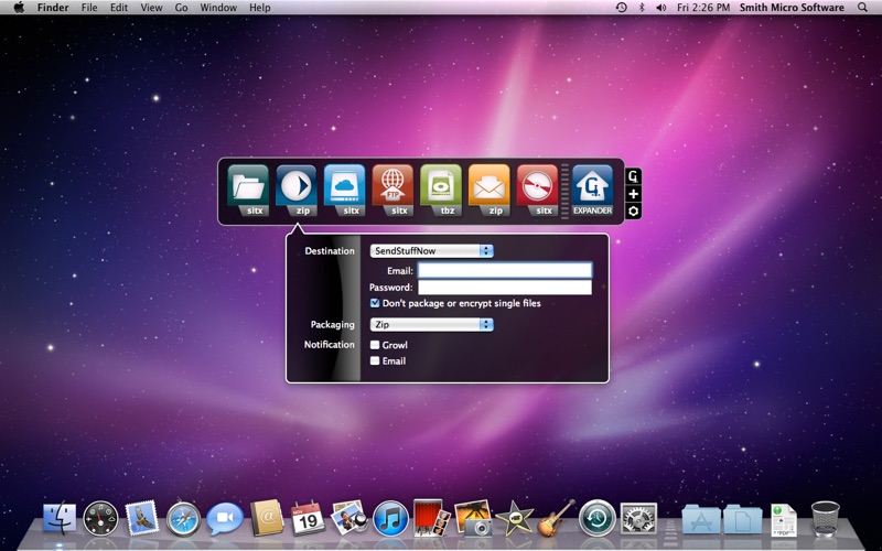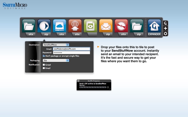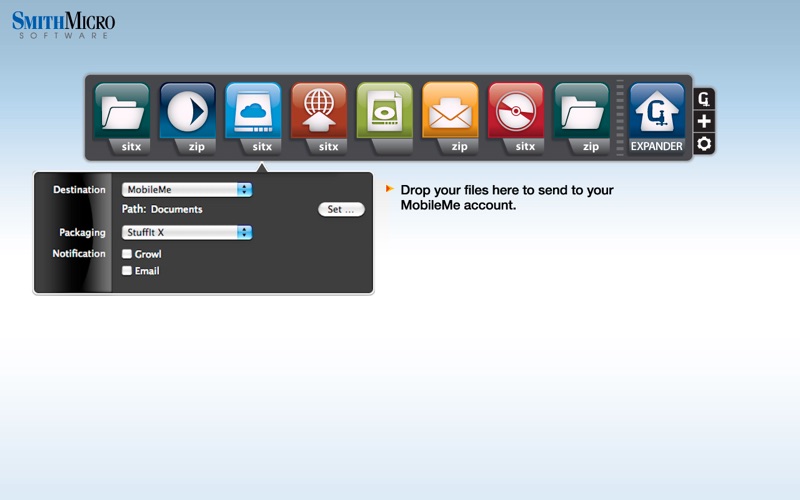 Its easy with the Destinations quick drag-and-drop tool! Pack and send your files any way and anywhere you want them to go without worrying about the details. Whether its SendStuffNow, MobileMe, FTP, email, or local drives, create as many custom tiles in StuffIt Destinations as you want. Just choose a destination, a compression format type with or without encryption, and a notification option, then simply drag and drop a file onto a tile and its off.