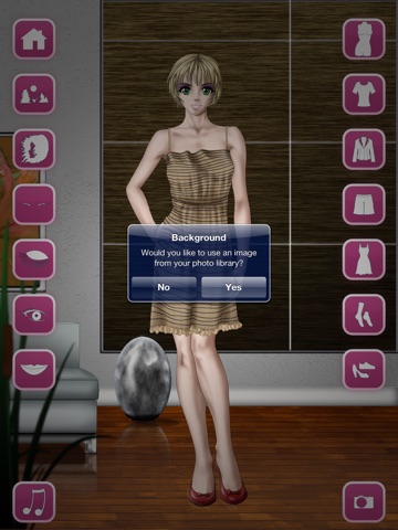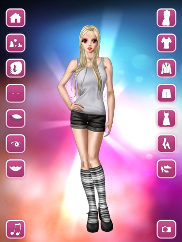 You can change hairstyles, eyes, eyebrows, lips, dresses, tops, jackets, skirts, pants, socks, shoes, skin color and the background.