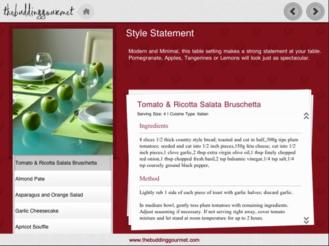 The Budding Gourmet “Style Menus Recipes” app is available FREE on the App Store.