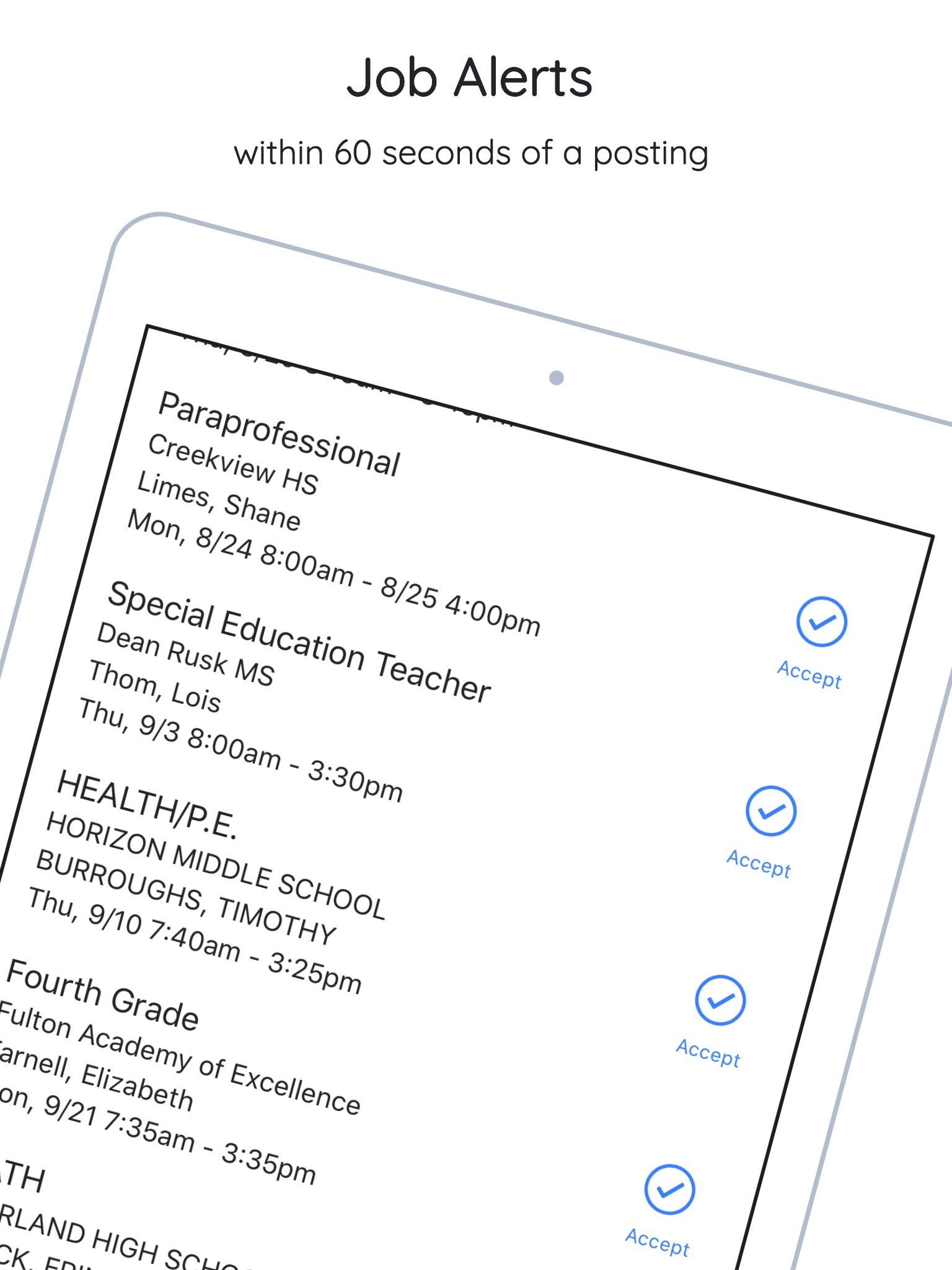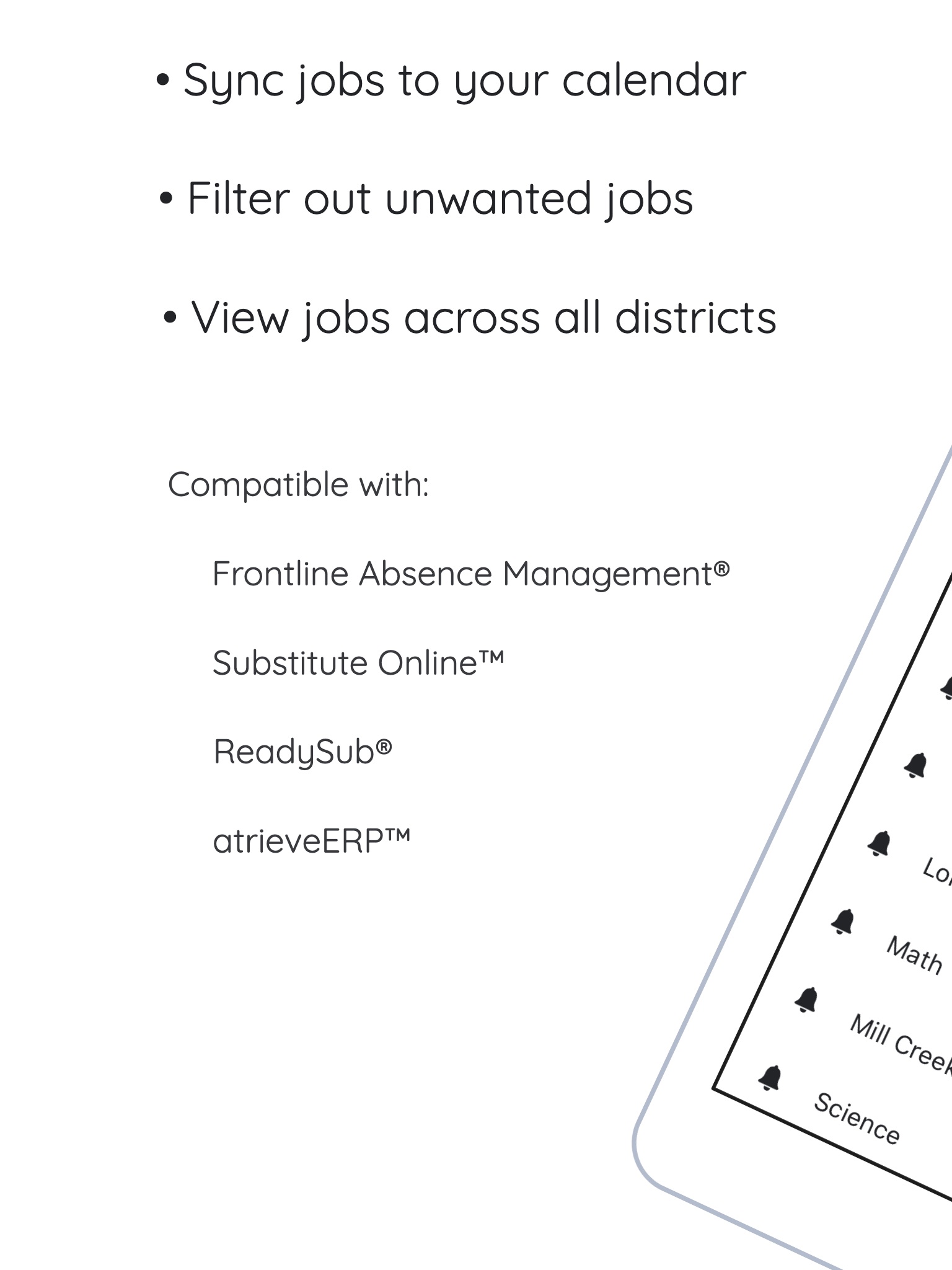 Quickly accept the jobs you want with fast and personalized job alerts, job booking, and calendar syncing for substitute teachers using Frontline Education Absence Management (formerly Aesop), ReadySub, Substitute Online, or atrieveERP!