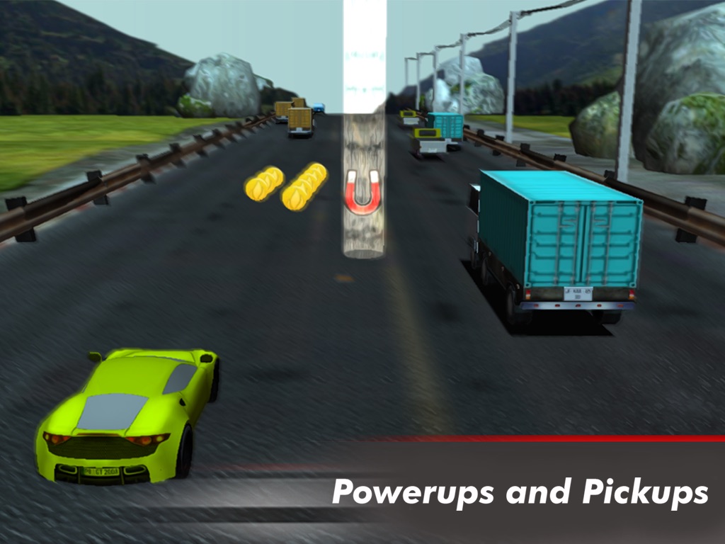 The player can collect coins, power ups, and unlock new cars.