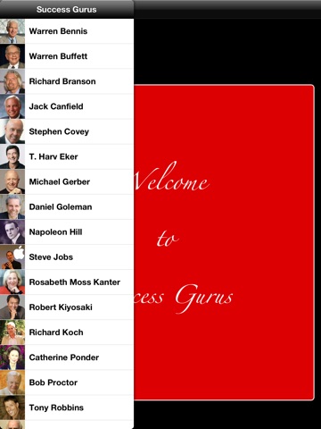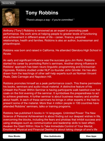 INSTRUCTIONS: Click on the name of the guru in the list to access information about that guru. Just select the iBooks, Audiobooks or Apps button to be taken directly to the iTunes catalogue for the guru. To return to the app, double click the home button and select the Success Gurus icon.