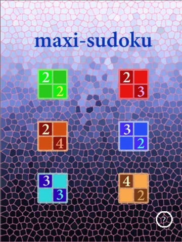 Maxi-Sudoku comes with 6 Sudoku flavors, ranging from the elementary 2x2 to the usual 3x3 square grids. Inbetween are versatile games of 2x3, 3x2, 2x4, and 4x2 squares. With our proprietary algorithm to always create a new and enjoyable game to play, Maxi-Sudoku can satisfy whims and fancies of players of all ages and skills.