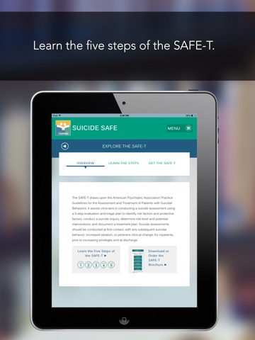 Suicide Safe is a suicide prevention learning tool for primary care and behavioral health providers and is based on the nationally recognized Suicide Assessment Five-step Evaluation and Triage (SAFE-T) practice guidelines. Suicide Safe helps providers feel confident to assist patients who present with suicidal ideation. The app offers tips on how to communicate effectively with patients and their families, determine appropriate next steps, and make referrals to treatment and community resources.