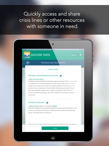 • Explore clinical and educational resources and share crisis line phone numbers and other patient-focused materials.