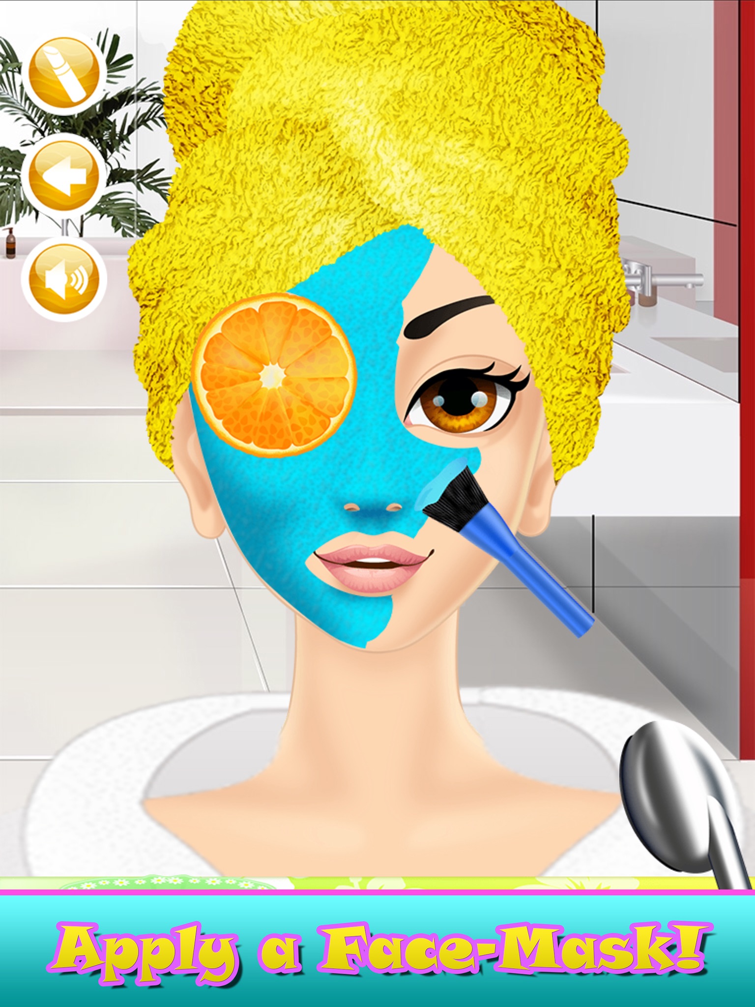 Start off at the refreshing Spa room! Help clean up with face-wash and water sprayer. Then, apply a cool blue face-mask, place fruit slices for the eyes, add concealer for blemishes and more!