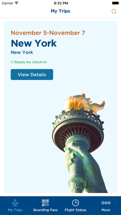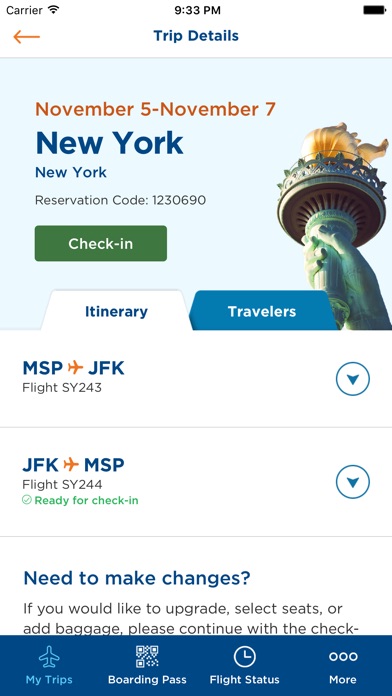 The Sun Country Airlines® iOS app is designed to make the day-of-travel experience easier. Both Ufly® Rewards members and guest users alike can gain quick access to upcoming trips within the United States. Available features include mobile check-in, boarding passes, flight status updates, and more: