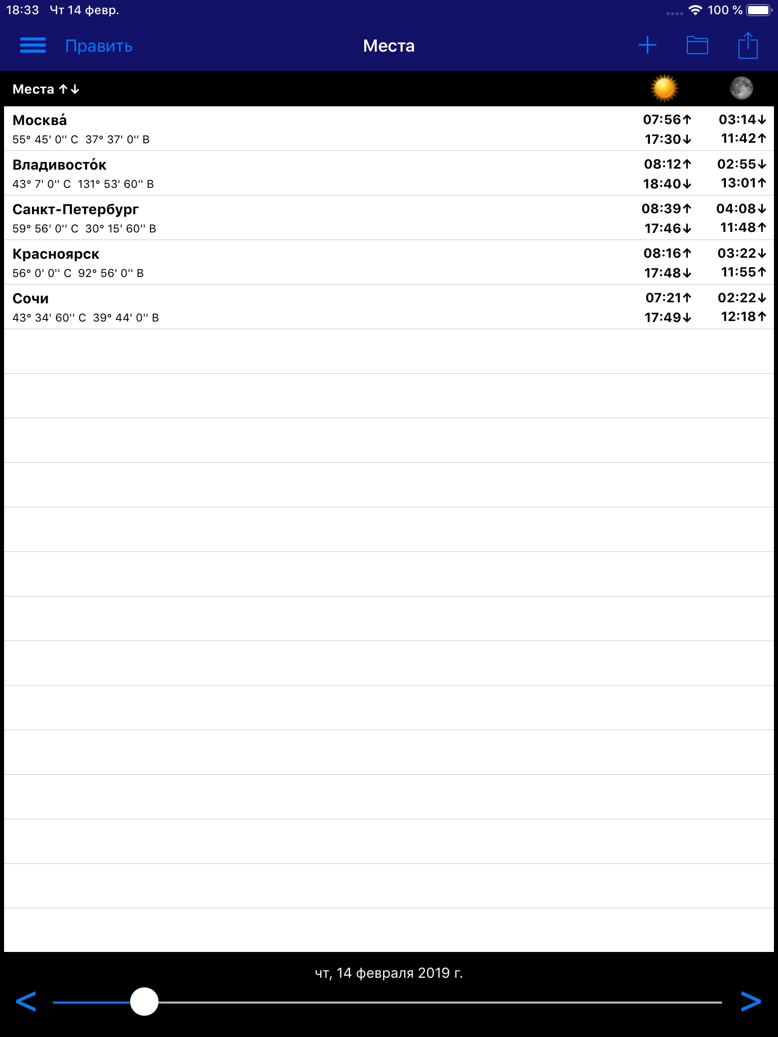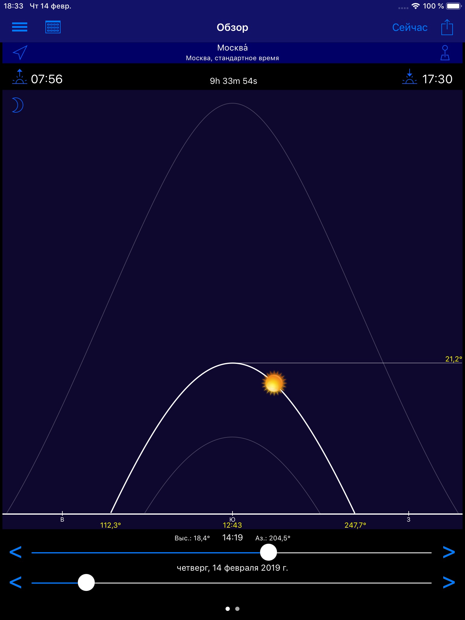 Calculate times of sunrise, sunset, moonrise (pro), moonset (pro) and more for your location at any given date.