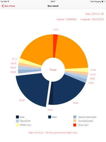 * Additional details showing time Sunrise & Sunset and Moonrise & Moonset times, Solar Noon, Golden Hour, Dawn, Dush and Nadir.