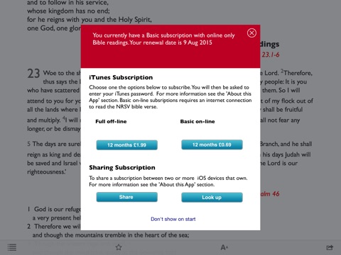 - A basic annual subscription where the Bible readings are only available when you are connected to the Internet. (Online-only access to the NRSV readings.)