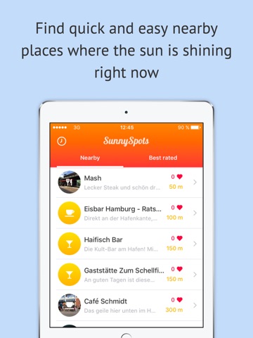 SunnySpots gives you a list of cafes, bars, restaurants or public places with their distance to your location. Have a look on the map and use the navigation to get to your chosen place.