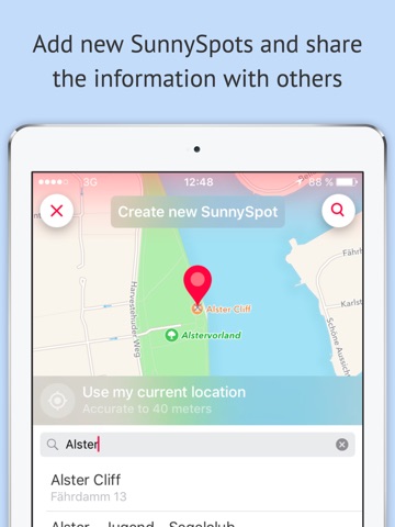 Share your latest SunnySpots with all other users, adding new SunnySpots with just a few clicks.