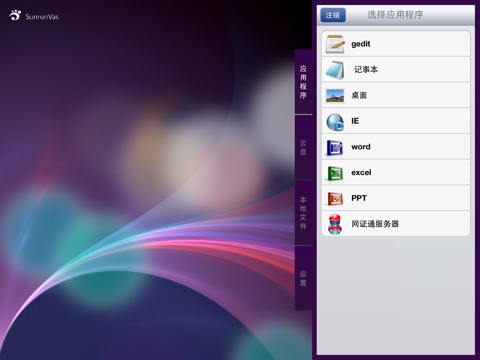 通过Sunrun VAS客户端连接Sunrun VAS虚拟应用服务器,就可以方便的在iPad和iPhone上使用服务器上发布的Windows或Linux应用,例如办公软件,浏览器等等