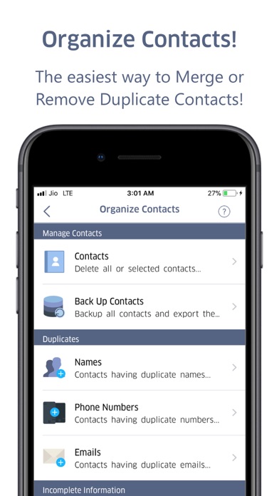 > Merge or delete duplicate contacts, find contacts with duplicate names, phone numbers or emails!