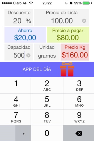 • Listo! Ahora solo tienes que tipear precios tal cual los ves en las góndolas. Y no hace falta escribir el punto decimal ni la tecla de suma o división. Solo tipeas el precio de lista y la aplicación muestra el importe real a pagar (y el ahorro, por supuesto).