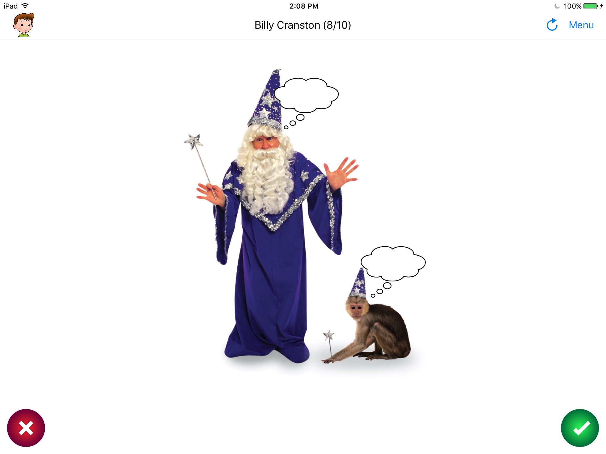 My students enjoy the pictures and like to make up more things,usually silly, that they could be thinking. Would like to see more apps like this! How about with the cats and dogs descriptive pictures? Or the babies? Students love to talk about them!