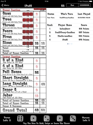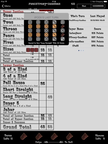 You get full throw by throw and hold by hold history for all the games you play so you can check anything you forgot. Also other players turns in multiplayer mode are sent to you as it happens, so you can keep up with the excitement of the game as it happens.