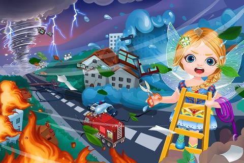 The fairies and their friends are in trouble after a big storm hit the city! As the fairy princess, it is your job to rescue your animals and friends, then help them clean up! Youre the hero of this story, so you better get to work. The castle is on fire and a big mess! Rescue the kids from the tower, put out the fire, and help clean up the tree limbs and debris from the courtyard. Fly above the field to rescue animals from the flood! Visit the forest to help your animal friends down from the trees!
