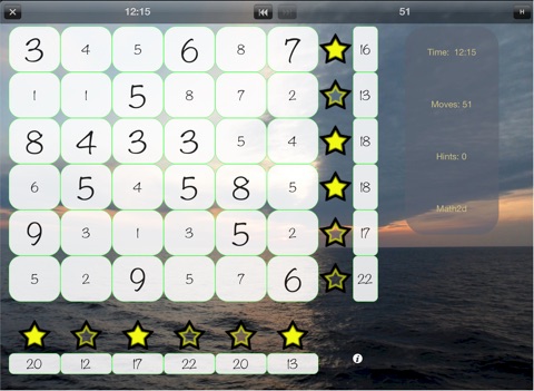 The challenge is to select which numbers will add up to each row solution shown at the right while at the same time solving for column additions shown at the bottom of the board.