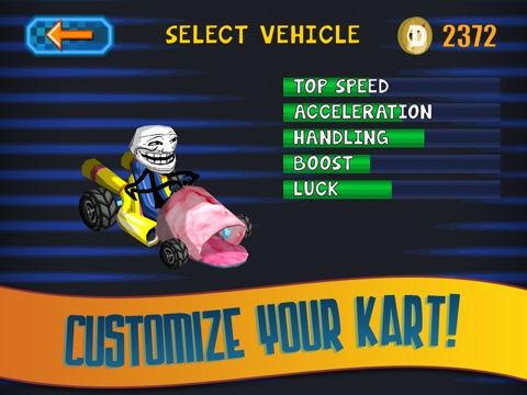 - Customize your kart with crazy kart bodies, tires, and accessories!