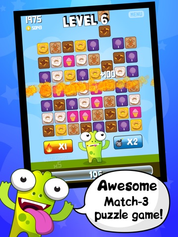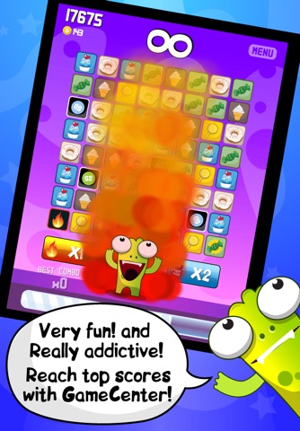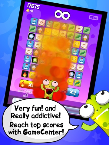 You have to match or swap two pieces on the board to form a line of three or more of the same-colored food cards. When you make a match the food bar increase! The goal is to fill this bar to feed the monster and complete the level. When you make many combos, special cards begin to appear. You can collect them to make special powers!! Reach top scores and complete achievements with GameCenter!!