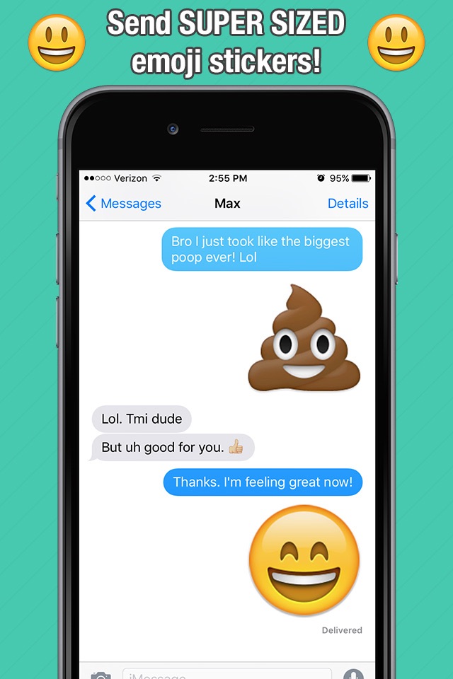 Step your emoji game up and send super sized emoji stickers to your friends and family. You can also combine the different emojis to make your own custom emoji picture to send.