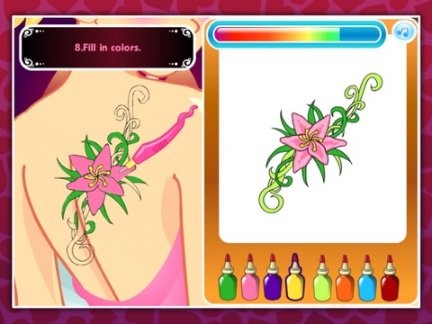 This Tattoo game is a fun game designed to dress up your characters body with some really fantastic tattoos that you get to design. You have the choice to choose several girls to tattoo. Draw a sketch, color and sterilize your tattoos of your customers like real tattoo shops.