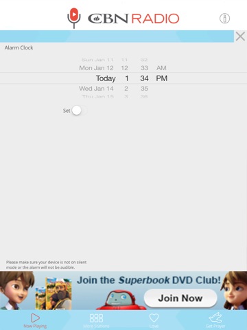 • Set an alarm to have Superbook Radio start playing at the time of your choosing