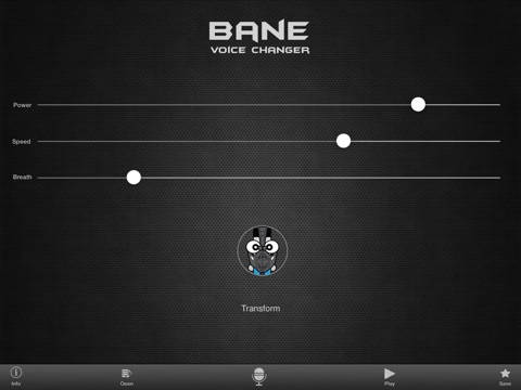 Live the Bane character you got to know from the Batman movies with Bane Voice Changer. The only app on the app store with realistic bane audio processing to transform your voice to Bane voice and 3D face filter! Simply record your voice, and transform it to Bane voice by hitting the Transform button. Your voice will be played back with realistic Bane voice. In addition, you can control the power of the Bane effect and speed of your Bane voice for maximum control.