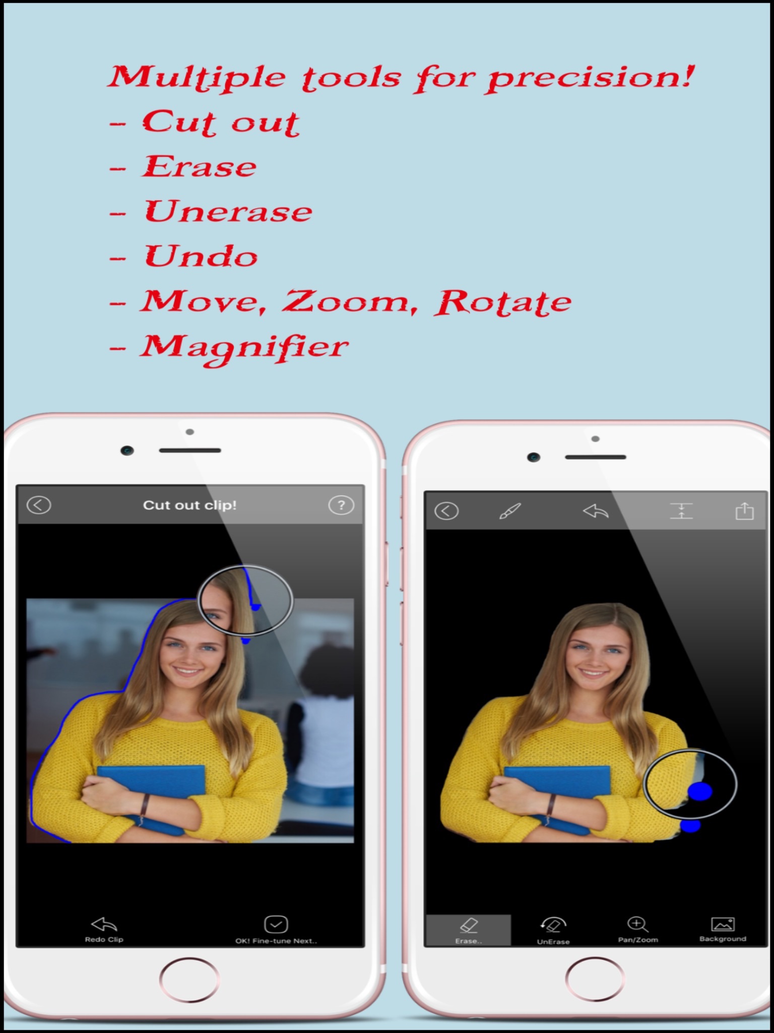 [+] Remove the background with advanced tools like lasso cut out using magnifier, erase using magnifier, unerase using magnifier, undo for errors.