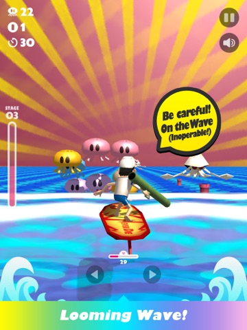 Now, only a forward riding a looming wave! Be careful because the obstacles and monsters come to bother the Takkun! (game over, when hit a rock or Clay pipe)