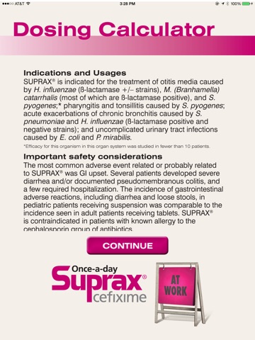 The Suprax® Dosing Calculator is a convenient tool that allows healthcare professionals to easily calculate the accurate dosage of each Suprax® formulation based on the patients weight range.