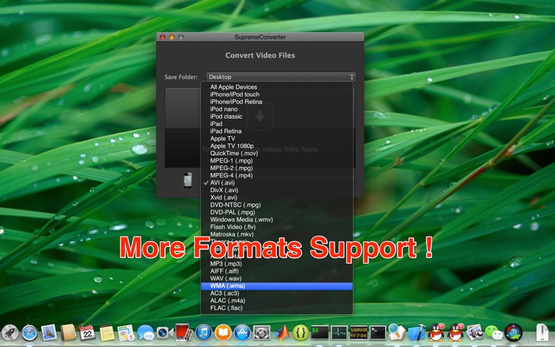 * Supported output - iPhone, iPad, iPod, Retina, Apple TV, QuickTime, MP4, AVI, DivX, Xvid, MPEG-1, MPEG-2, DVD, Windows Media, Flash, Matroska(.mkv), Theora(.ogg), WebM, M4A, MP3, AIFF, WAV, WMA, AC3, ALAC