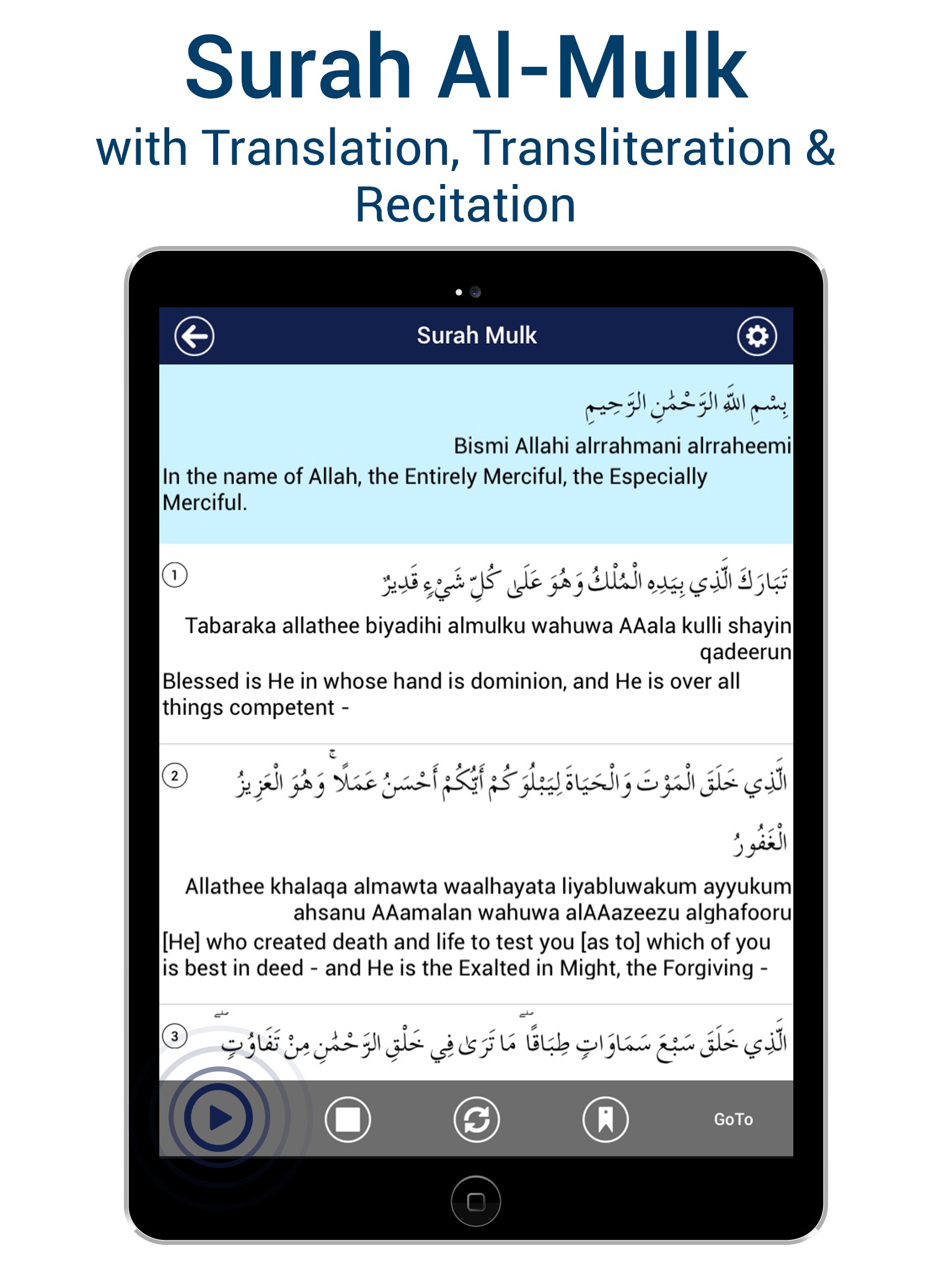 Surah Al Mulk is an Application designed to facilitate the Muslims all around the world with its blessings and virtues. This Islamic application features Surah al Mulk with proper Arabic Tajweed, transliteration and translation in multiple languages.