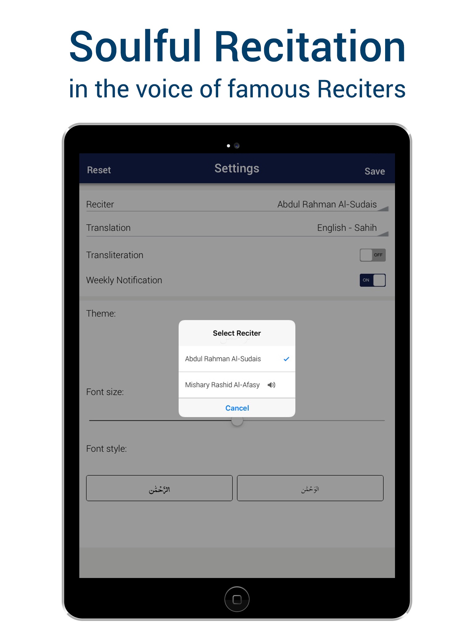 • Select from different Reciters (Al-Sudais, Al-Afsay) for soulful recitation