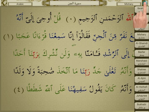 - 20 world famous reciters including Ibrahim, Al-Sudais, Moeqali, Mishary, Al-Ghamdi, Basfar, Manshawi, Shatree, Al-Ajmi, Al-Hothefi, Juhaynee, Abdul Basit, Ayub, Budair, Al-Dukali, Al-Hussary, Bukhatir