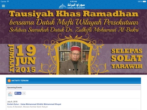 Mobile Application of Surau Al-Barakah providing comprehensive information related daily activities, Talks (Kuliyyah Zuhur/Jumaat), announcements, article (Al-Quran and Hadith) and interesting programs throughout the month.