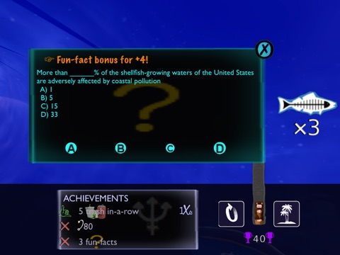 • Crank up score and learn more about the ocean by answering the multiple-choice fun-fact questions at the end of each session.