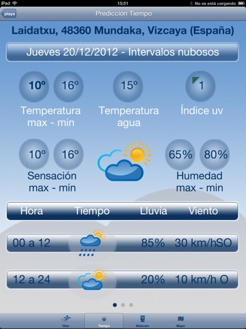 - Predicción meteorológica con temperatura mínima y máxima, temperatura del agua, sensación térmica mínima y máxima, humedad mínima y máxima, índice UV, probabilidad de lluvia o nieve, y predicción y comentarios sobre viento, sol, nubes y lluvia.