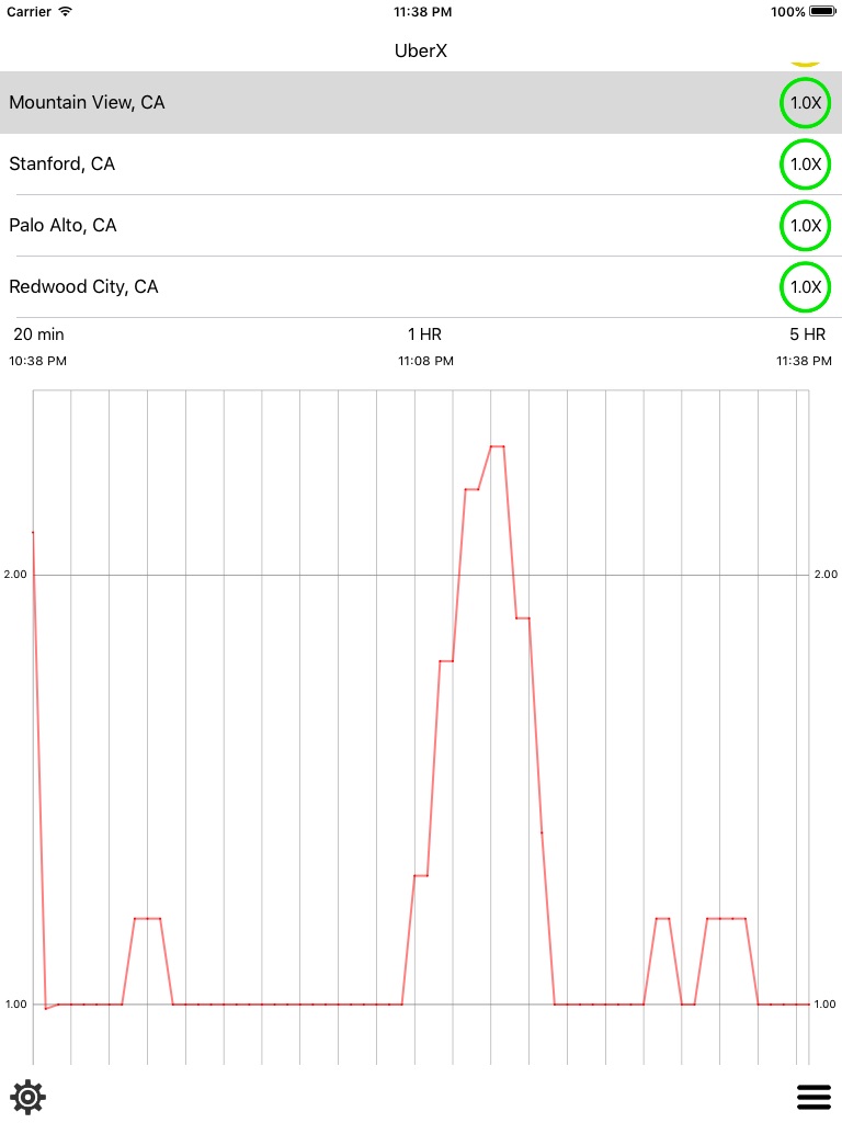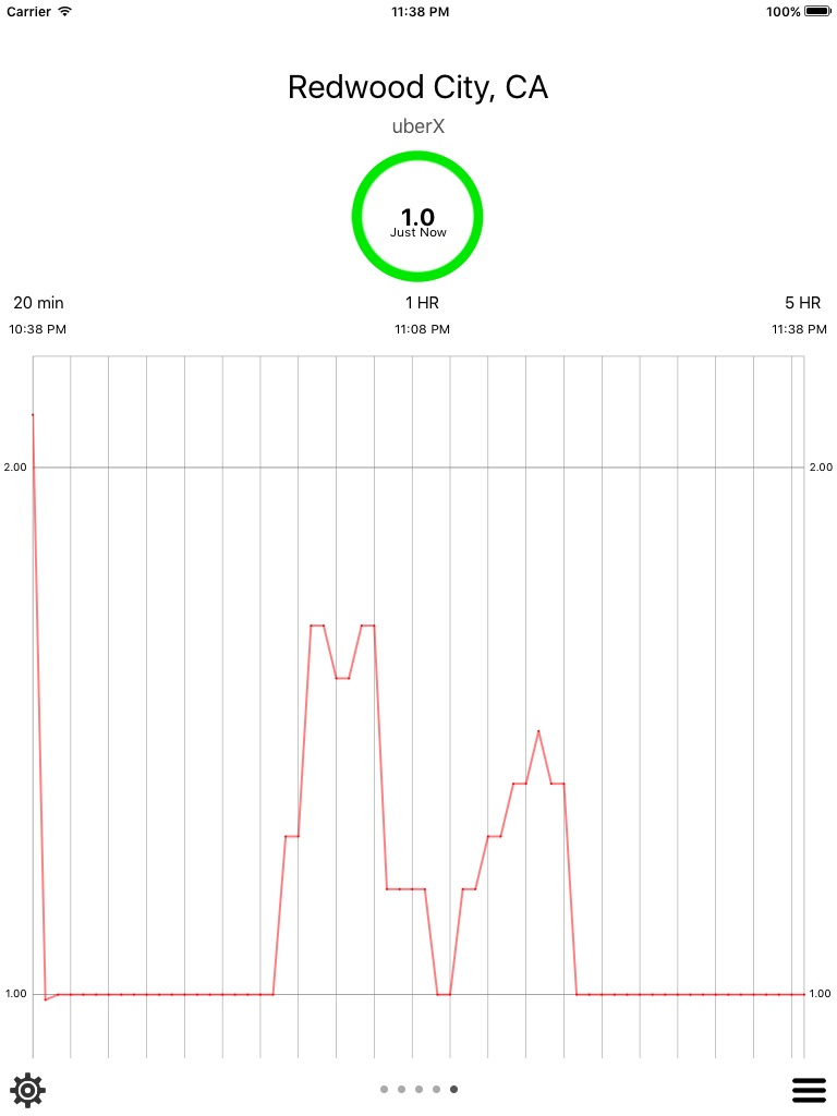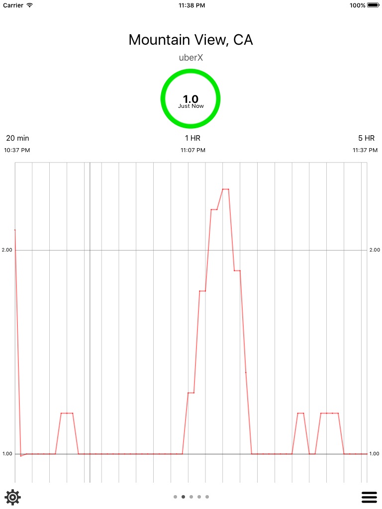 Surge Alerts has three views. A single location view, multiple location view, and a geographical view. A realtime graph is also displayed to show overall trend which helps you predict best time to drive in future.