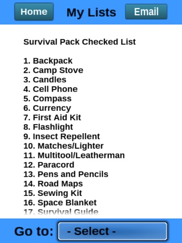Each ounce of preparation can mean pounds of safety, health and comfort! SurvivalPack offers a prioritized list of items to be considered when assembling one or several backpack kits to be quickly relied on when prompt departure and/or self-reliance is demanded in emergency situations. From standard essentials like waterproof matches, spare keys, flashlight and pocket knife, to special-use gear like car power inverter, green laser pointer and potassium iodide pills, over 100 items are listed and pictured, with details and suggestions on use, and an Internet reference source for additional information. Version 2.0 allows the user to select choices from among the items and save the selection to a particular list, then email it to self, friends or family as a reference. The developer plans to update the list and app features based on continuing research and user suggestions, and invites such suggestions via a link in the app "information" screen.