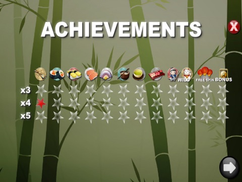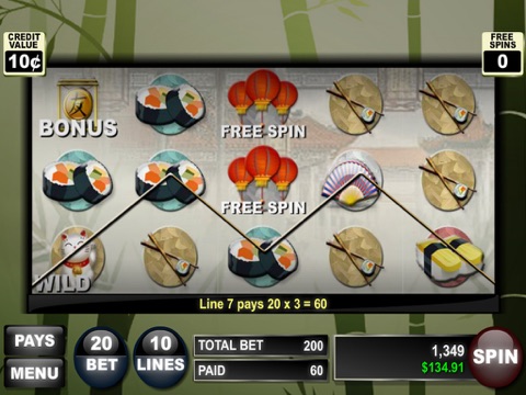 Sushi Dojo (5 Reel Slot Machine) with more features, more lines, higher limits, and more chances to win than ever before! Swipe up for a max bet if you’re feeling lucky. Swipe down to spin the reels. Up to 30 credits per line and up to 15 lines per game give you the winner’s edge! Changeable credit values ranging from 1¢ to $10. Daily game cash rewards just for playing. Earn your way to 60 trophies and fill your sushi craving with piles of cash. A delicious way to kill some time.
