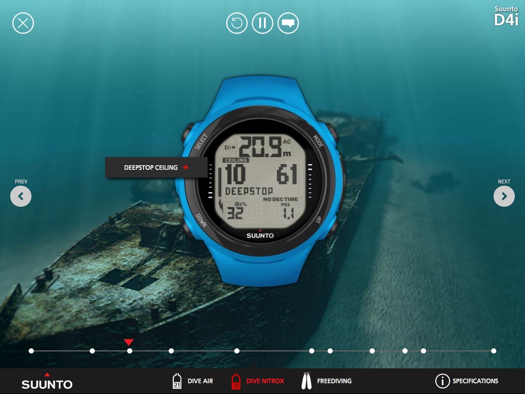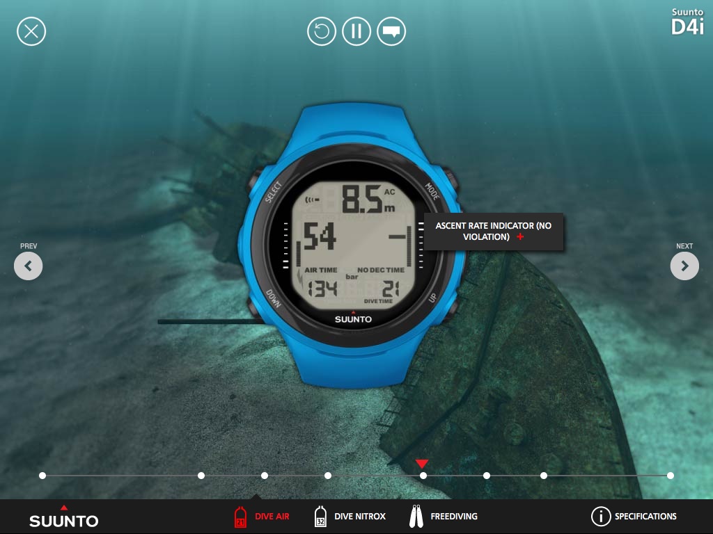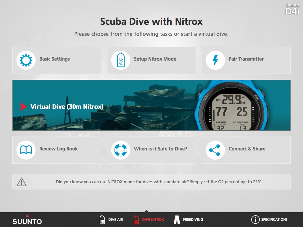 This tool shows you how to perform a variety of tasks, from setting up air and nitrox diving modes, through to accessing dive logs. In addition, this tool features virtual dives (air, nitrox and freediving), showing you how the computer operates during a dive.