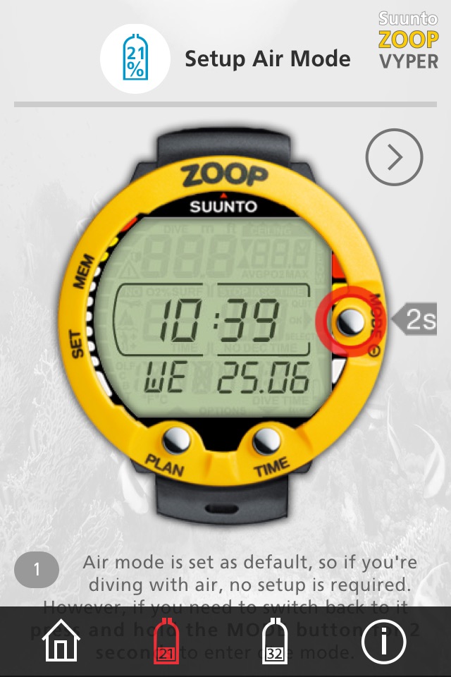 This tool shows you how to perform a variety of tasks using the Zoop/Vyper, from setting up air and nitrox diving modes, through to accessing the memory log book. Furthermore this tool features two virtual dives (air and nitrox), showing you how the Zoop/Vyper operates during a dive.