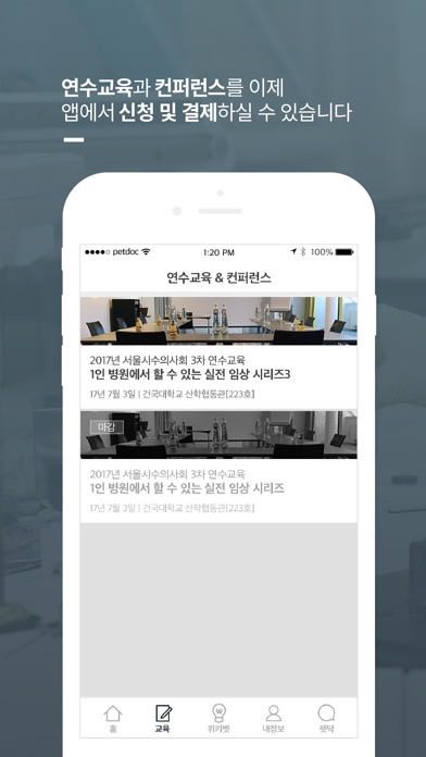 현재 수의사연수교육과 임상 컨퍼런스의 원터치 예약 및 결제서비스 등이 제공되고 있으며, 향후 임상자료실(위키벳 통합 서비스 제공), 동물병원 운영자료실, 회원전용 쇼핑몰 등 다양하고 실용적인 서비스가 추가될 예정입니다.
