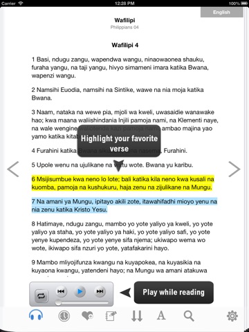 We are happy to offer Swahili Bible with Audio for your iPhone, ipad and iPod. It comes with essential iOS features, utilizing the power of apple device for Swahili speaking community.