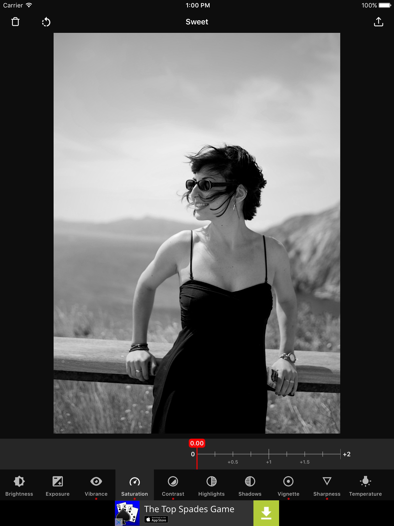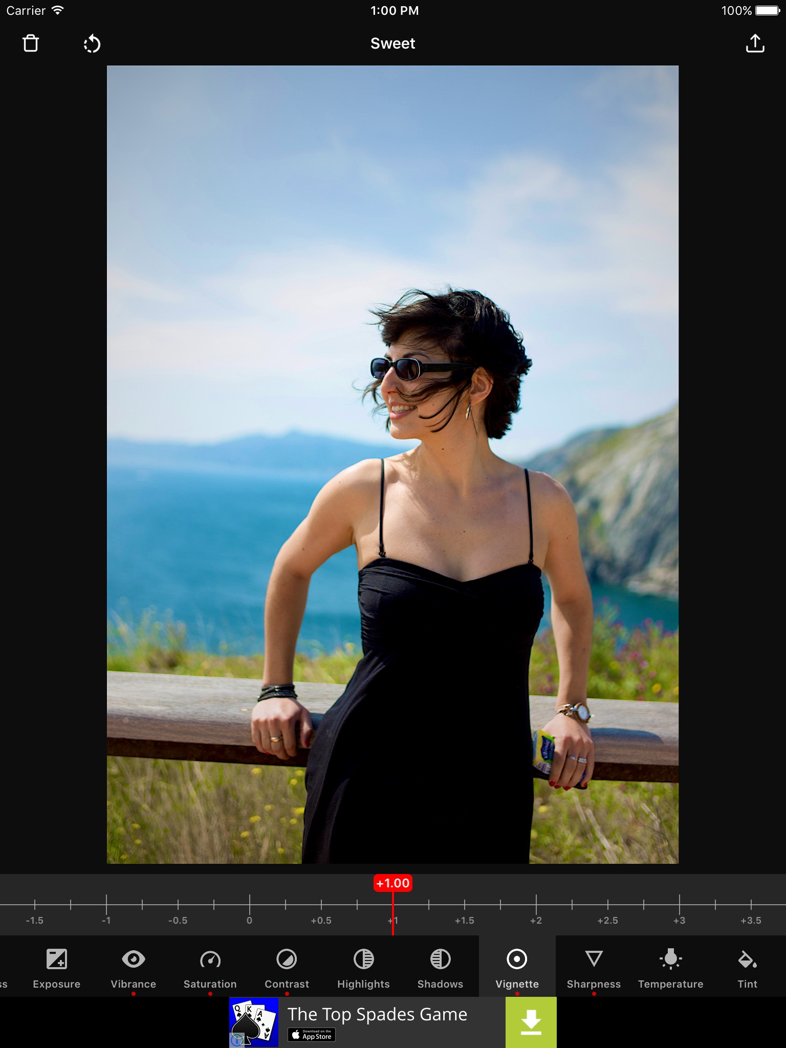 A very simple and direct photo editor with adjustments for brightness, exposure, vibrance, saturation, contrast, highlights, shadows, vignette, sharpness, temperature and tint and ability to control them granularly to achieve the exact look you are after.